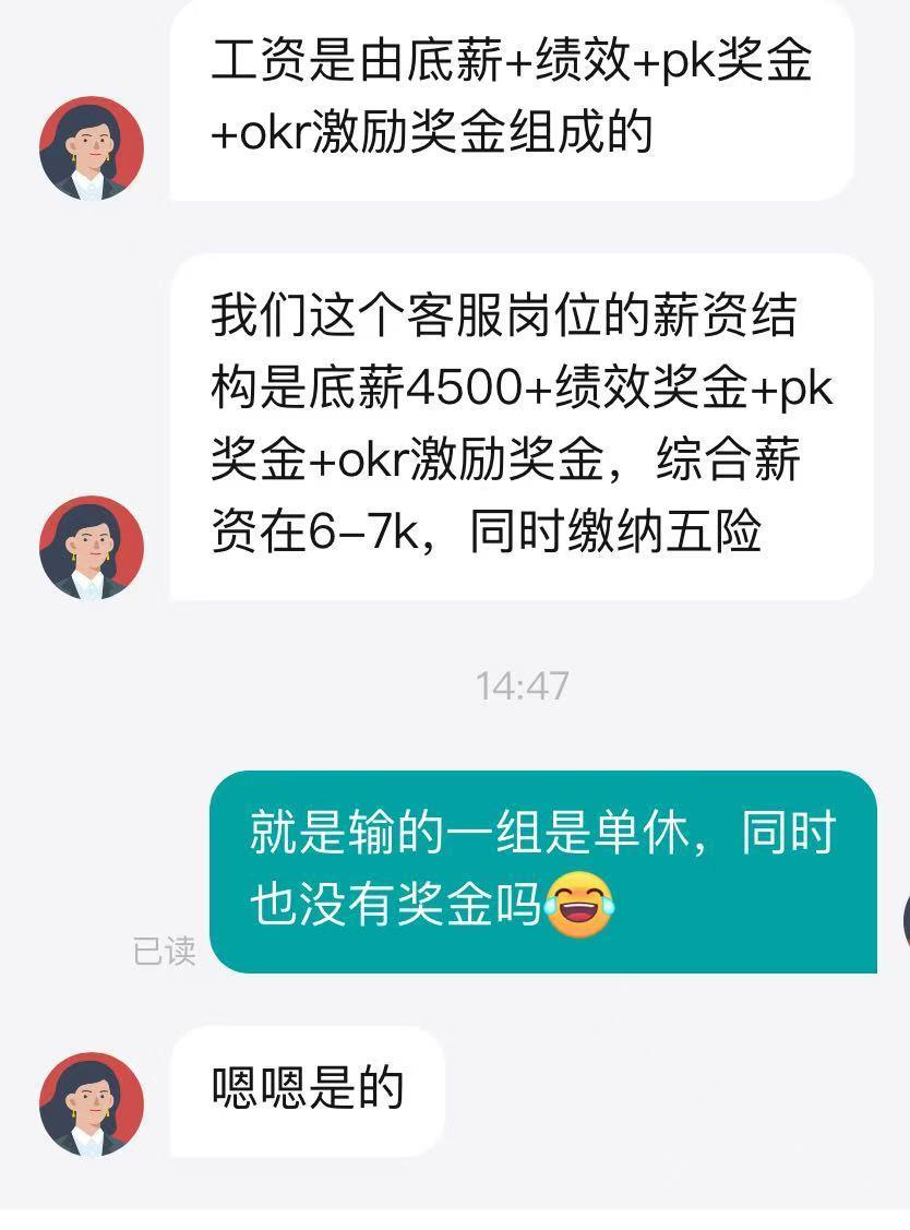 记者问询,查核数据输的一组是不是单休,一起没有PK奖金,对方表明“是的”。